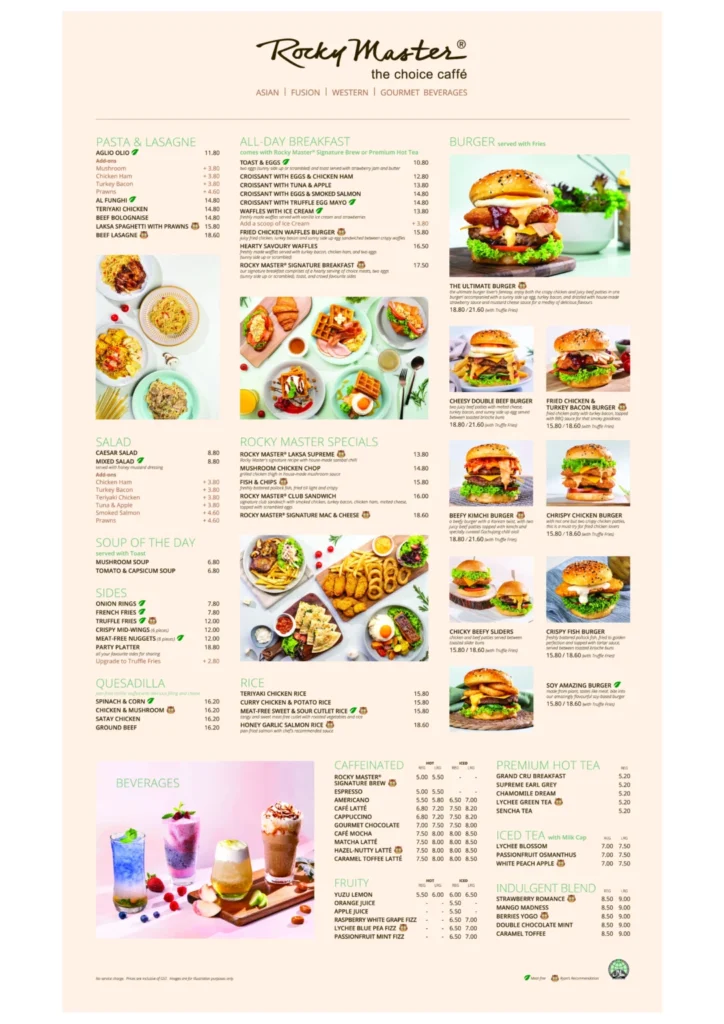 Rocky Master Singapore Menu has been neatly organised into some other categories that include Breakfast, Burgers, Pasta & Lasagne, Soup, Salad, Specials, Rice, Quesadilla, Sides, and Beverages.